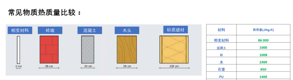 現代建筑業材料有著輕質化,模塊化的趨勢,與此同時帶來的是建材嚴重缺乏熱質量,導致樓宇能耗高,熱舒適性差。而集成了相變材料的建材可以大大增加建筑物的熱質量,和隔熱材料配合使用,能有效降低樓宇能耗25~30%。